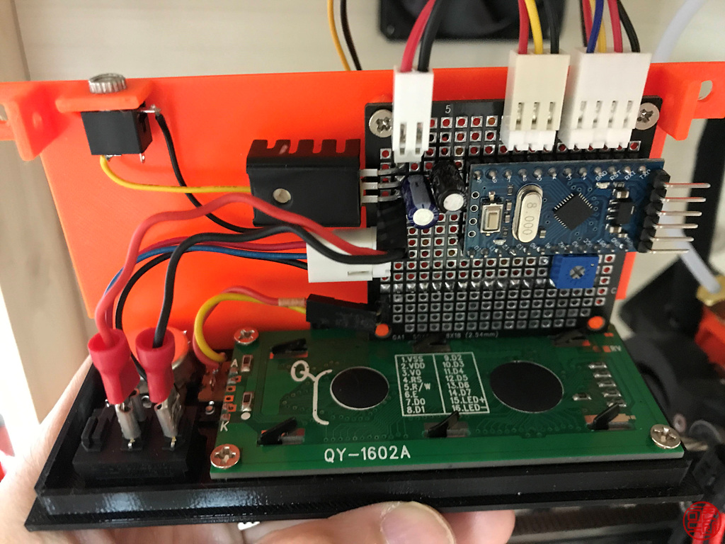 프루사 미니의 내부에서 전원을 따서 --> 상단의 컨트롤러로 들어가고요... 여기서 팬, LED, 온습도 센서로 연결됩니다.
