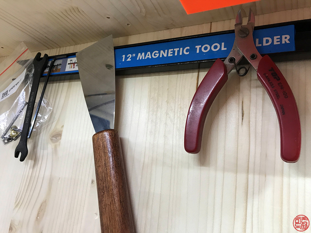 그리고, 자주 쓰는 공구들을 어떻게든 이 안에 넣으려고 고민하다가 자석 공구 거치대가 있더라고요. 그걸 내부에 달아 주었더니 안성 맞춤입니다.