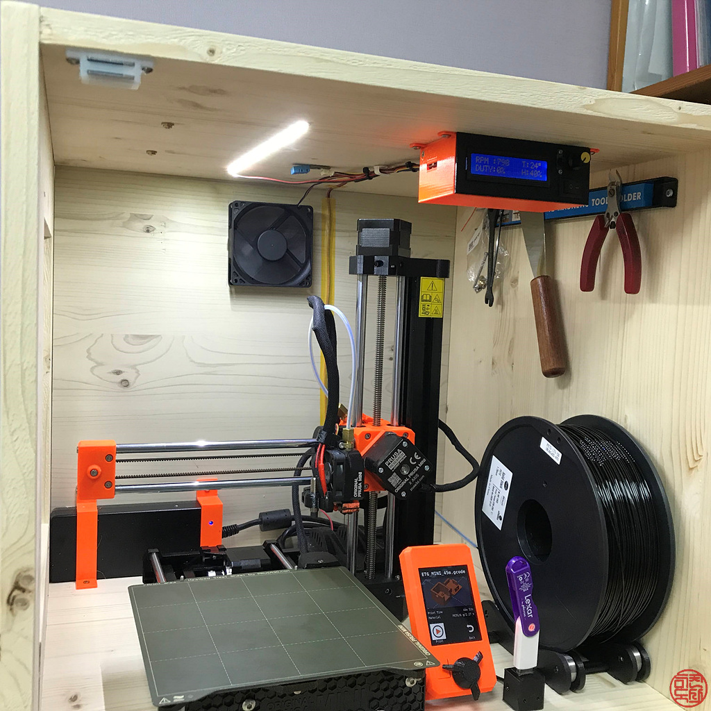 이렇게 해서 프루사 미니 인클로저를 완성했습니다. 아이들 어릴 때부터 해서 13년 정도 목공방을 다니면서 제가 그림 대충 그리면 공방 사장님이 재단해주셔서 공방에서 이런저런 도구들 써서 이것저것 만들 때엔 그닥 어렵지 않았는데, 제가 상세 설계해서 재단된 목재(그나마도 몇 개는 좀 휘어서 조립이 어려웠음) 구입해서, 얼마 없는 공구로 주말마다 베란다에서 만드느라 시행착오도 꽤 많았습니다. 그래도, 공방 좀 다니면서 만드는 것 옆에서 곁눈질했던 게 큰 도움이 되었네요. 그리고, 제가 취미로 만지작거리는 아두이노도 접목시켜서 저만의 인클로저를 만들어 보았습니다.
