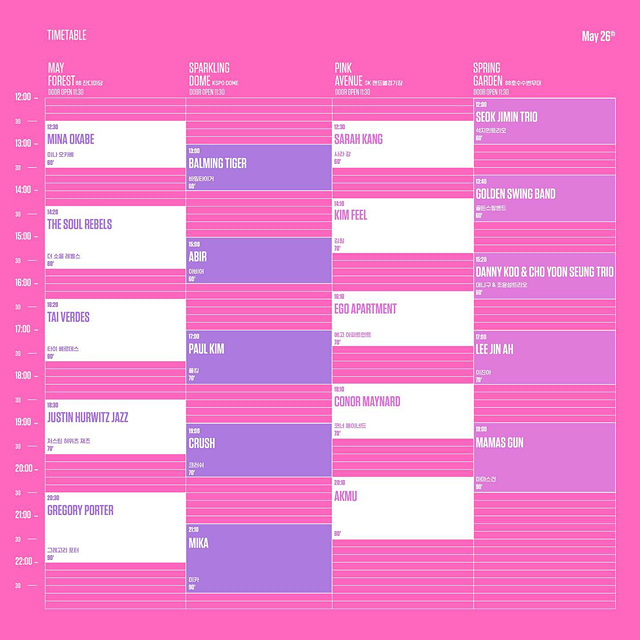 시간표를 보면 모든 아티스트에 대해 1시간 이상의 무대를 할당해줘서 아티스트의 공연을 온전히 즐기기에 충분한 페스티벌이다. 다만, 시간이 겹칠 수 있어서 시간 배분을 잘 해야 하겠어.