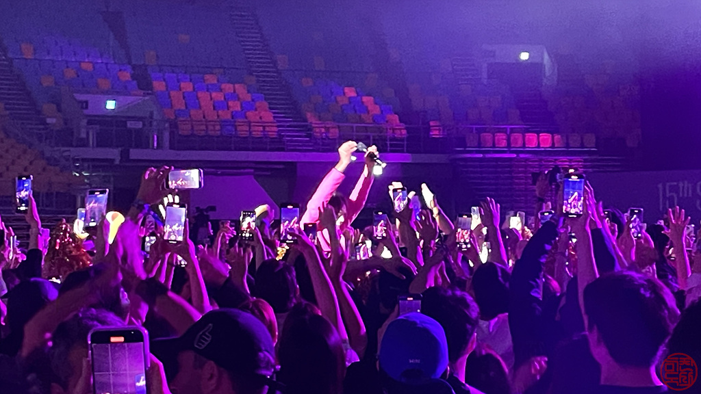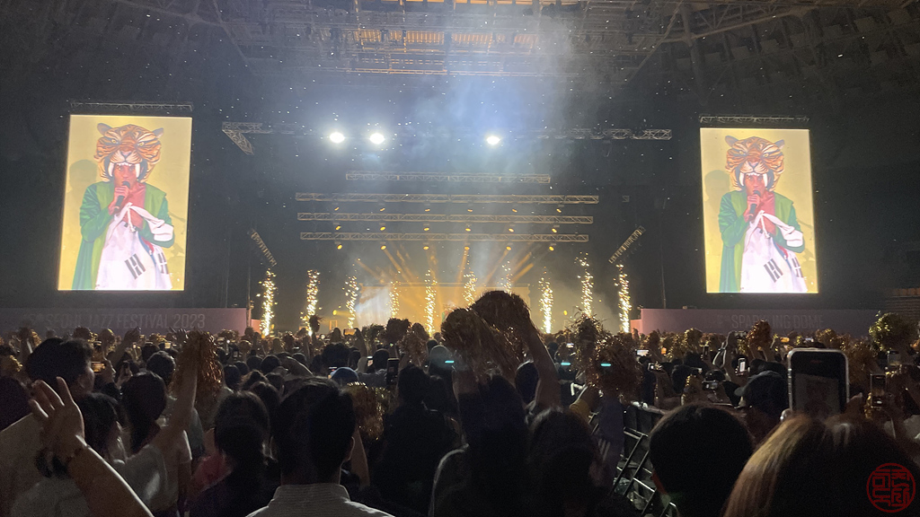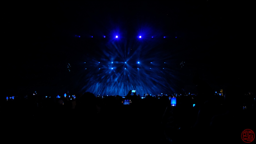 중간 펜스 근처에서 볼 수 있을 것 같았는데, 아무래도 너무 빽빽하게 서서 보는 것보다 살짝 뒤에서 여유있게 즐기기로 하고 자리를 옮겼다. 큰 애는 제일 앞줄에서 중앙 펜스를 잡았고, 호주 친구도 근처에 있었고, 둘째는 중간쯤 펜스의 중앙 통로 근처에 자리 잡았다. 공연은 9시 10분 시작으로 예정되었으나 약 10분 정도 늦게 시작했다.