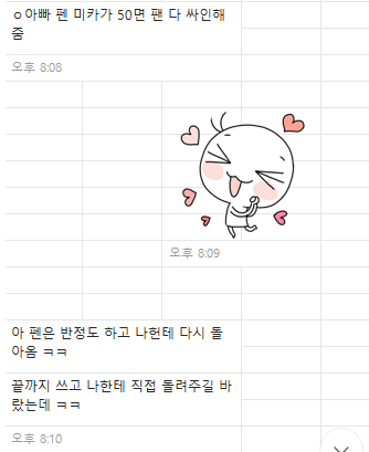 방송이 끝나고, 미카가 밖에 있던 팬들 하나하나 만나서 사인도 해주고 사진도 같이 찍어주고 얘기도 나눴음은 충분히 예측할 수 있는 일이었는데, 딸이 아래와 같이 톡을 보내왔다. ㅎㅎ