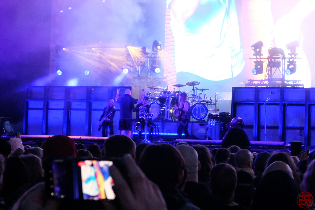 왼쪽 옆에는 술 좀 취한 듯한 중년의 남녀 서너명이 신나게 춤추고 놀았던 것 같다. 추운데도 나도 신나서 박수 치고, 소리 지르고, 하늘 찌르기하고, 헤드 뱅잉하면서 재밌게 보고 있으니, 아까 옆에서 맥주 마시던 아가씨가 날 툭툭 치더니 주먹 인사하자 그런다. 하하. 그 많은 관객 중에 동양인은 나 혼자이지 않을까 싶었는데, 머리 허연 동양 사람이 신나게 공연 보는 게 좋아 보였나 보다.