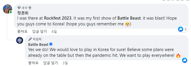 배틀 비스트 공연 사진에 댓글 달았더니, 밴드 측에서 답장도 해줬다.