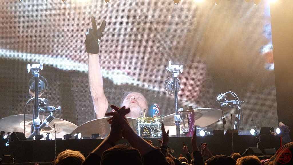 이번엔 파워 발라드 'Bringin' on the Heartbreak' 1981년 앨범 수록곡인데, 이 곡 나올 때던가, 타계한 기타리스트 스티브 크락(Steve Clark)의 영상이 비쳐졌던 것 같다. 바로 이어서 원래 앨범에서도 바로 다음 곡이며 연주곡인 'Switch 625'을 연주하는데, 우와! 이래서 이들이 NWBHM(New Wave of British Heavy Metal)의 대표 주자 중 하나구나. 연주가 진짜 탄탄하고 헤비하다. 초기 앨범들은 많이 듣진 않았는데, 예사롭지가 않다. 아앗. 릭 앨런의 드럼 솔로로 이어진다.