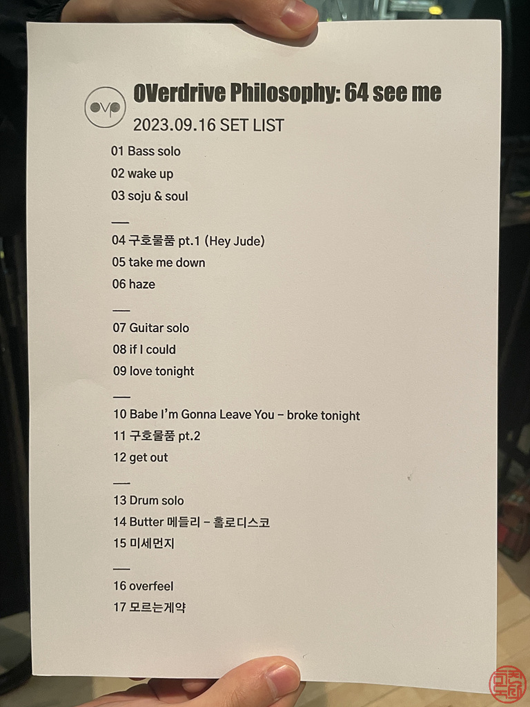 이 날 공연 셋리스트는 다음과 같다. 공연 끝나고 박근홍이 관객 한 명에게 건네준 건데, 양해를 구하고 사진 한 장 찍었다.