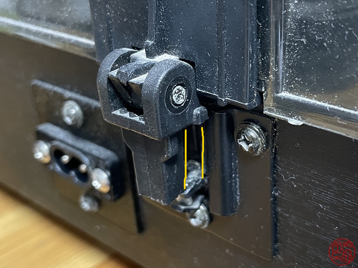 노란색 화살표 부분을 보면 경첩 아래 부분이 깨져서 더 아래로 밀리지 말라고 못을 박아놓은 것이 보인다. 저 경첩 안쪽에 강한 스프링이 들어있어서 턴테이블 덮개를 열면 열린 상태로 버티게 해주는 역할인데, 그 스프링이 너무 세고 세월이 흐르다 보니 플라스틱 경첩 부분이 못 견디고 아래 방향으로 깨진 것이다. 이렇게 놓고 지냈는데 (사용도 거의 안 했는데) 저 스프링이 결국에는 덮개 경첩 부분을 완전 박살을 내고 튕겨나갔다.