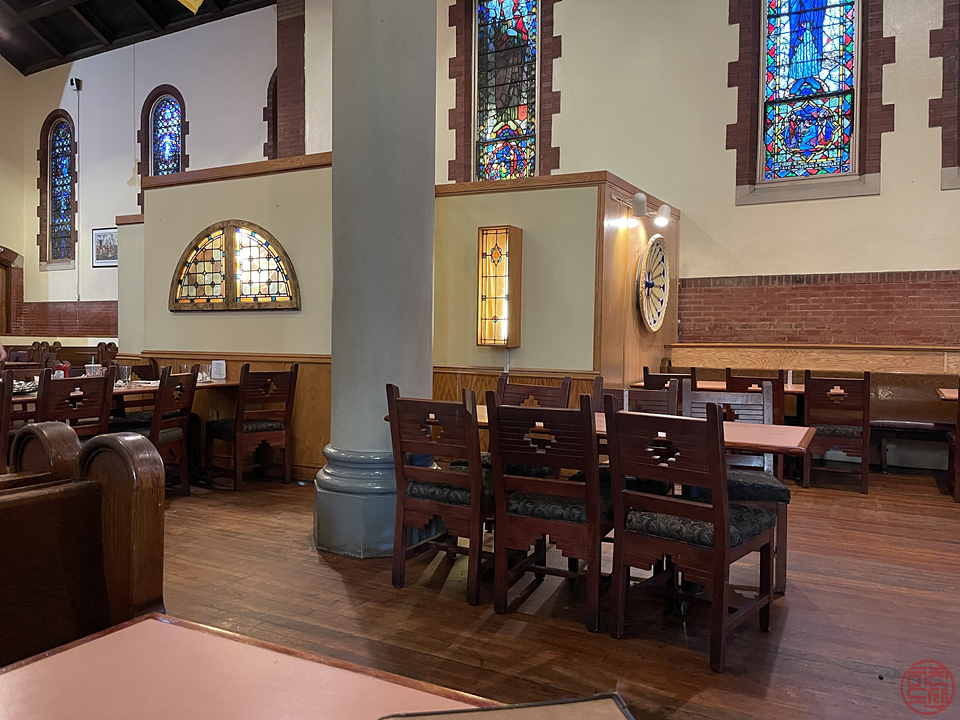 내가 교회 구조를 잘 몰라서 그냥 영화 같은 데서 본 느낌으로 그런 게 아니었을까 싶은데, 저기는 주방인 듯. 종업원들이 저기를 들락날락한다.