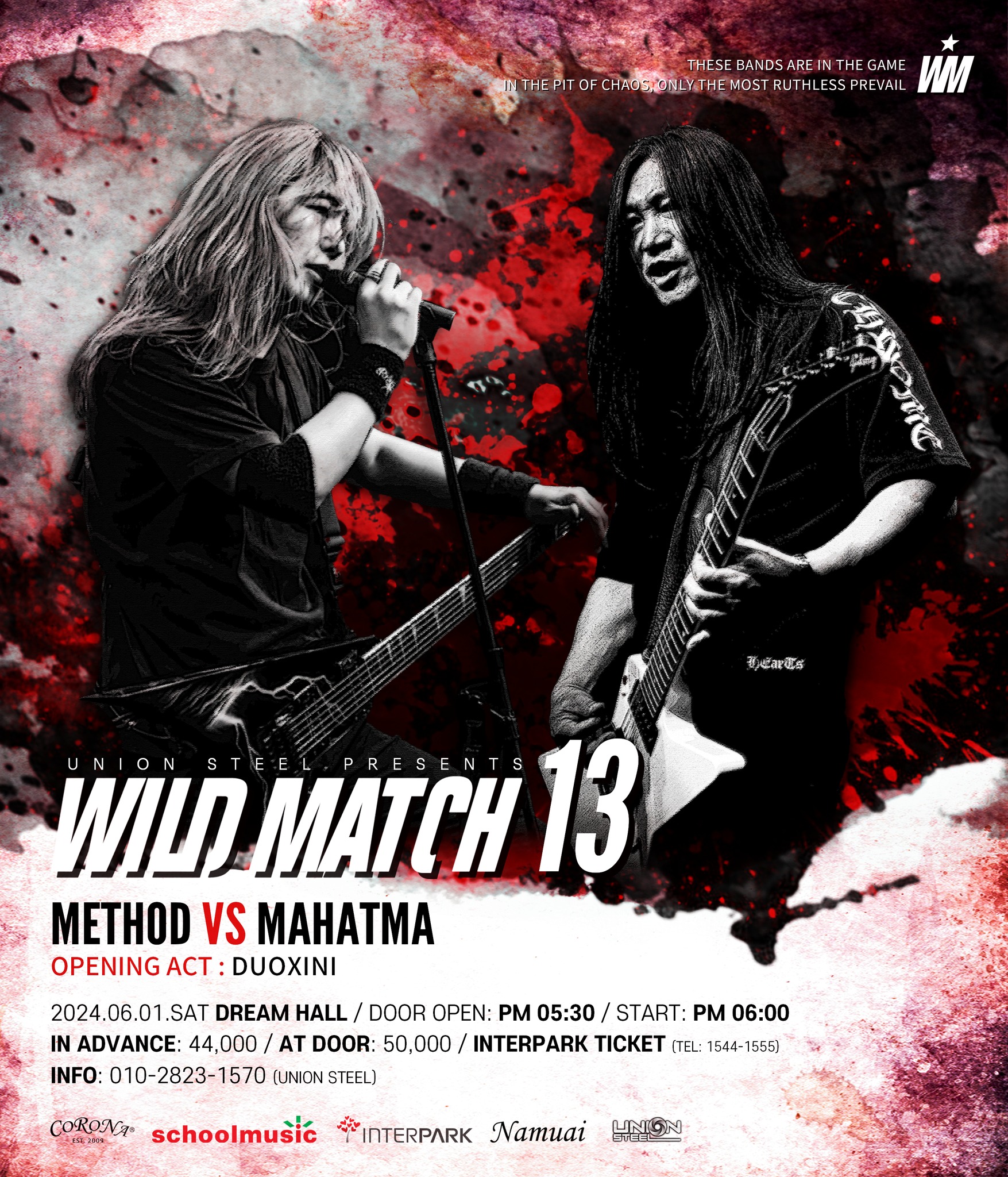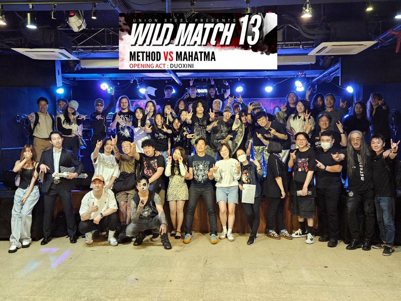 오늘 이 와일드 매치의 13회차 공연이 있었습니다. 주인공인 밴드는 이제 한국 쓰래쉬 메탈의 큰 형님들 격이 된 '마하트마'와 '메써드'였습니다. 오프닝 밴드로는 작년에 미니 앨범 내고 씬에서 주목 받고 있는 젊은 3인조 신예 쓰래쉬 밴드 '두억시니'였습니다.