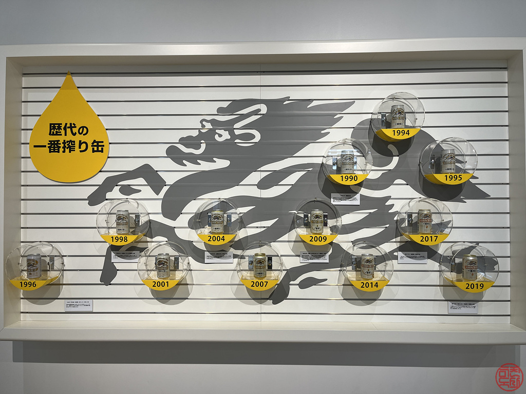 현재 기린 맥주의 대표 라인업인 '이치방 시보리'의 디자인도 전시되어 있다.
