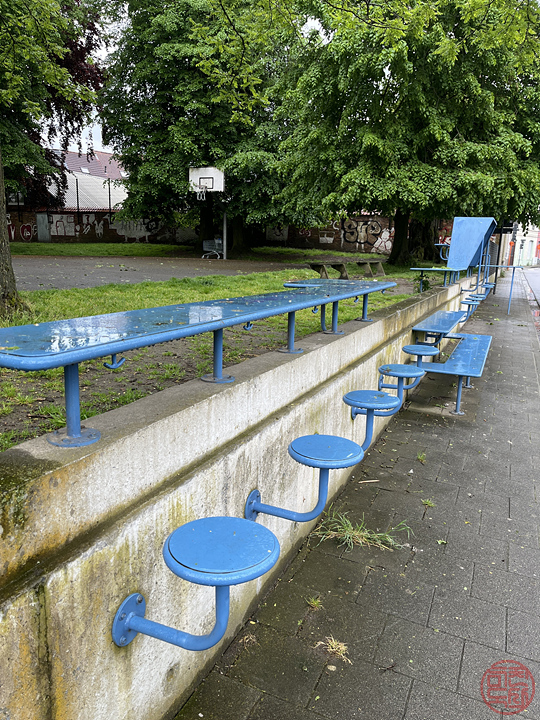 일단 뭐 먹을 걸 사러 가기 위해 바로 나왔다. 집 근처에 카르푸 수퍼마켓이 있어서 걸어가는 중에, 동네 놀이터가 있는데 뭔가 앉아서 먹거나 놀거나 할 수 있는 시설이 눈길을 끈다.