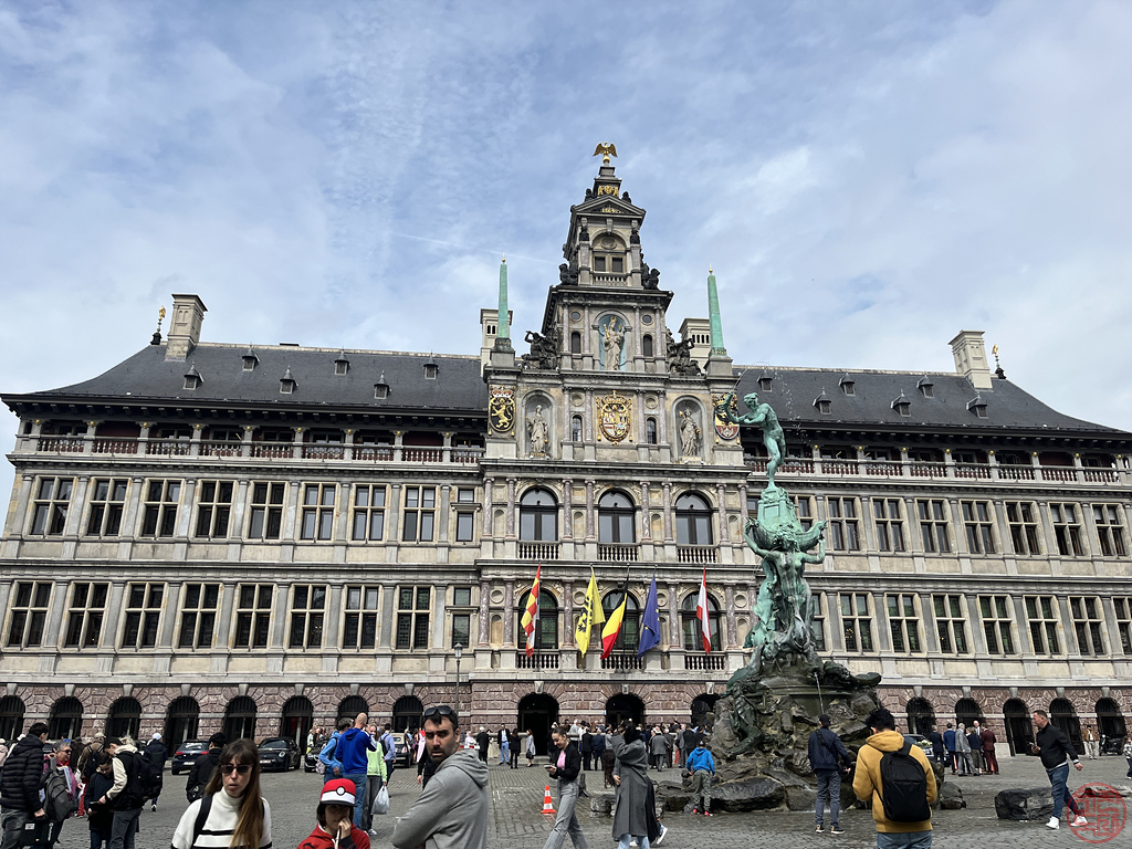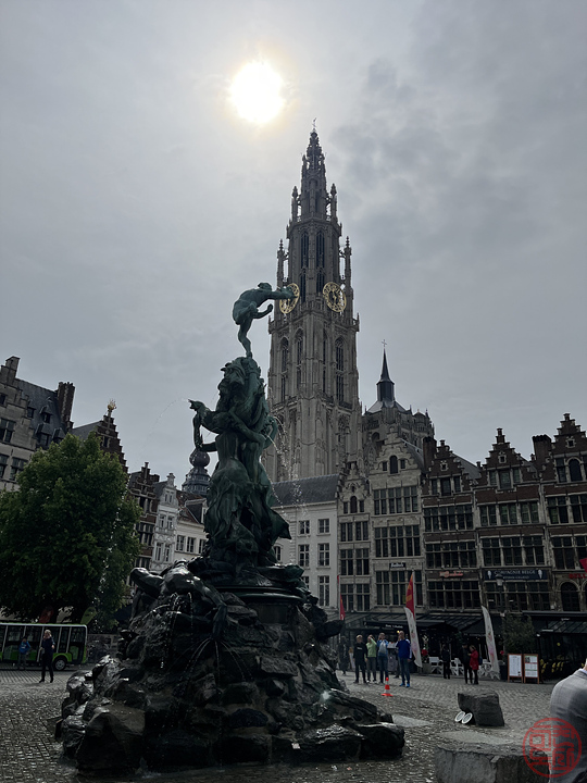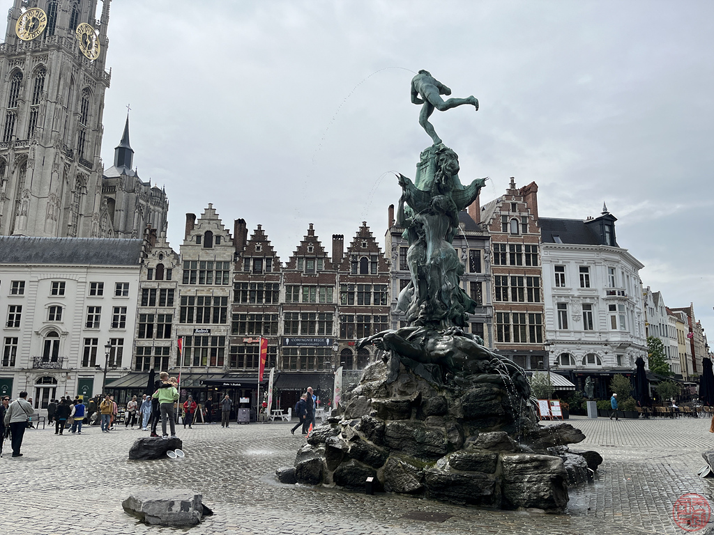"광장 중앙에는 앤트워프에서 가장 유명한 신화 인물인 브라보의 초록 조각상이 우뚝 서있습니다. 전설에 따르면 브라보는 수로를 이용해 도시로 들어오고자 했던 사람들에게 과도한 통행료를 부과했던 거인을 죽인 위인이죠. 동상은 브라보가 거인의 손을 스헬데 강으로 던지는 모습을 묘사하고 있습니다."