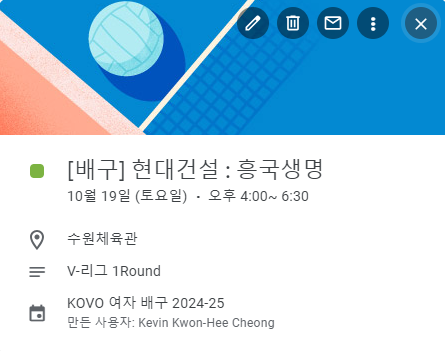 | 🏐 2025-2026 KOVO 여자부 V-리그 일정 구글 캘린더 공유! (0) | 2025.09.02 |