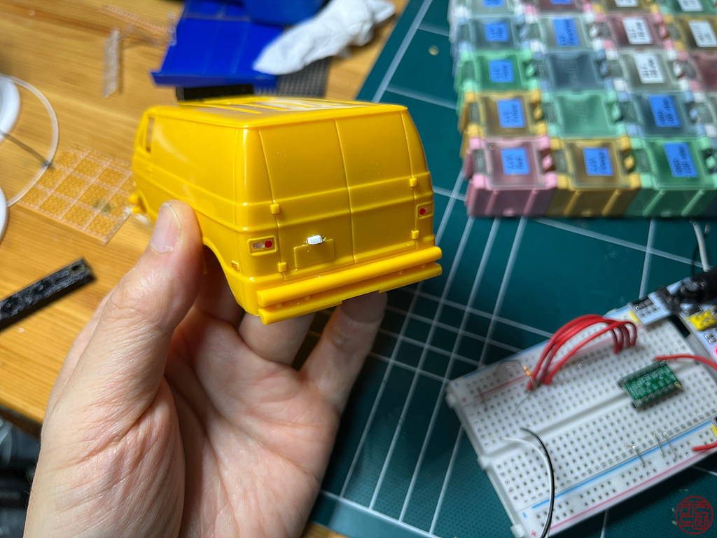 그리고, 차체 위에 있는 라이트는 필라멘트 LED를 기구물을 하나 만들어서 장착하는 걸로 구현