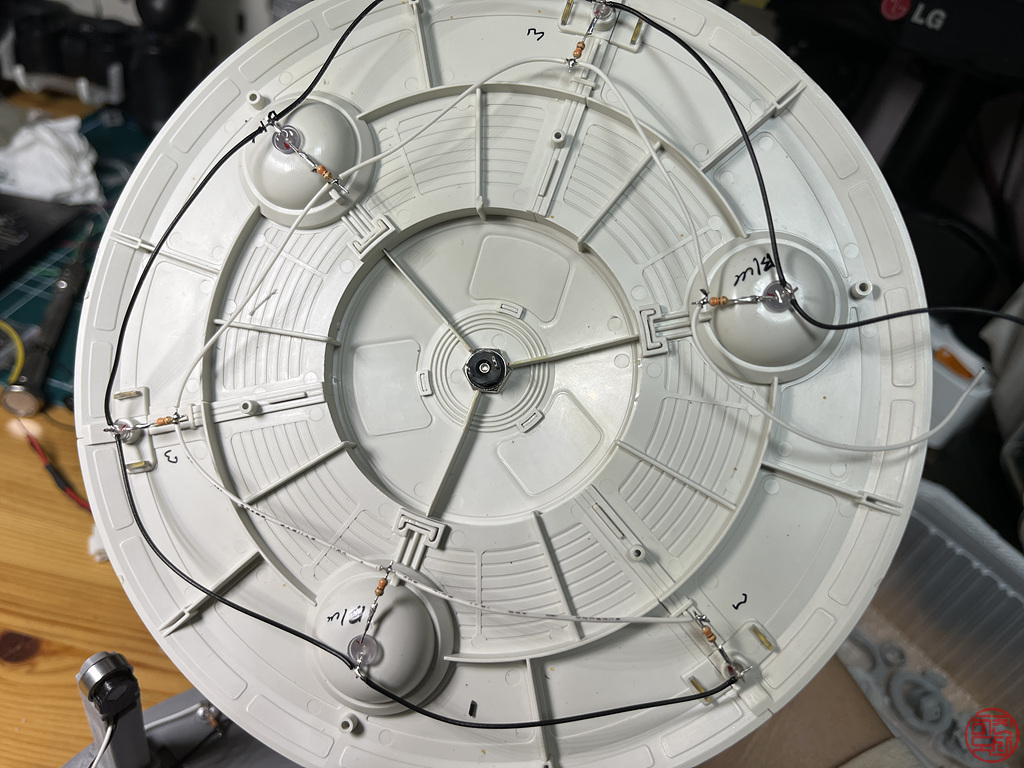 그리고, UFO 모형은 LED를 넣을 수 있는 자리가 미리 만들어져 있어서, 거기에는 전원만 인가하면 RGB가 연속적으로 변하는 LED들을 배치했다. 여기에도 MCU를 쓸 수 있지만, 복잡해져서 변색 LED를 쓰기로 했다.