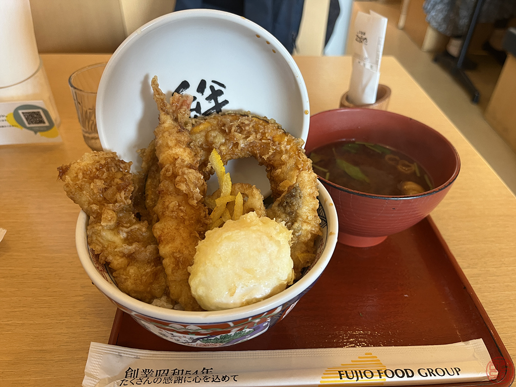 새우, 오징어, 단호박, 수란, 연근, 생선 등의 튀김이 얹힌 것이었는데, 가격은 1150엔, 대략 11,000원? 정말 훌륭하지 않은가? 새우 튀김은 예상한 맛이긴 한데, 오징어 튀김이 정말 예술이었다. 살이 통통한 것이 부드럽기는 말로 설명하기 어려울 정도였다. 다들 너무 맛있었다. 맥주 한 잔 시켜 같이 먹으면 딱이겠으나, 다음 일정 때문에 맥주는 패스~