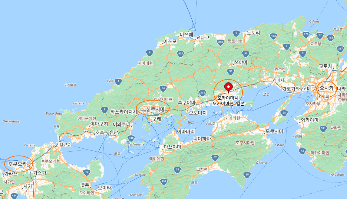 오사카와 후쿠오카를 일직선으로 그엇을 때, 3등분을 한다면 오사카 쪽에 가까운 도시가 오카야마, 후쿠오카에 가까운 쪽이 히로시마라 할 만한 위치였다.