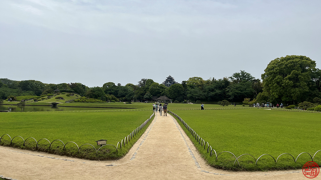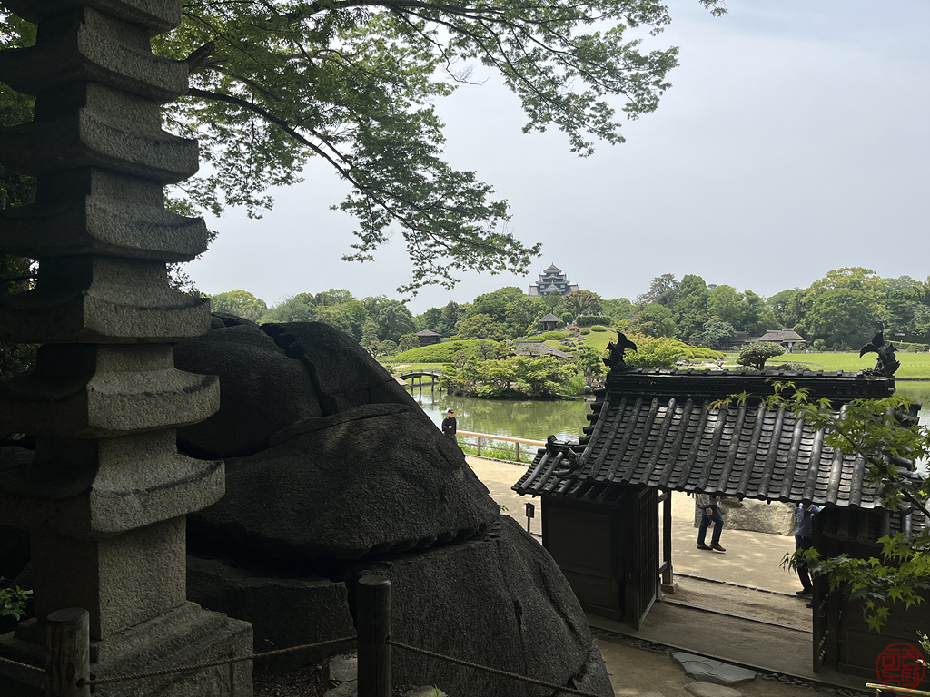 저 앞 정면에 오카야마 성이 보이고, 왼쪽에 큰 연못 오른쪽에 정원의 주인이 머물고 손님을 접대했을 법한 건물이 있다.