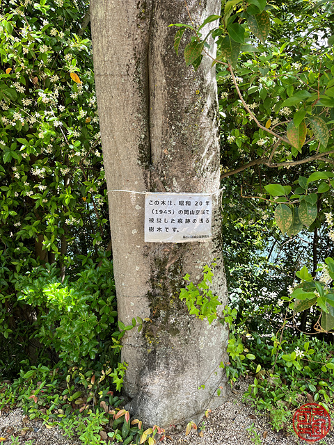 | 일본어 원문: この木は、昭和20年(1945)の岡山空襲で被災した痕跡の残る樹木です。 (福山市緑化推進協議会寄贈) |