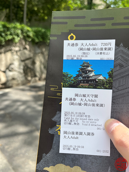 성이 크지 않은데, 전체 색이 검어서 특이하다. 이 성이 검어서 까마귀성(烏城)이라고도 불린다는데, 저 '까마귀 오(烏)'자가 '검을 오'라고도 하니까 그게 그거라 하겠다. 그냥 성 앞만 보고 가기엔 아쉬우니 한 번 들어가 보기로 한다. 건물 안쪽에 매표소가 있는데, 표를 살 때 고라쿠엔 입장권이 포함된 표를 구입할 수 있다. 그럼 더 싸다!