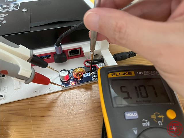 그래서 구현이 어렵지 않으면서도 현실적인 방법으로 적용하기로 했다. 12V 1.5A 일반 어댑터를 사용하고, 여기에 XL4015 칩 기반의 step-down 레귤레이터 모듈을 연결하여 출력 전압을 멀티미터로 확인하면서 5.1V로 세팅했다.
