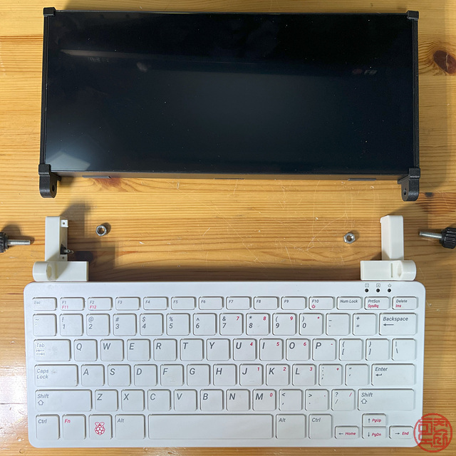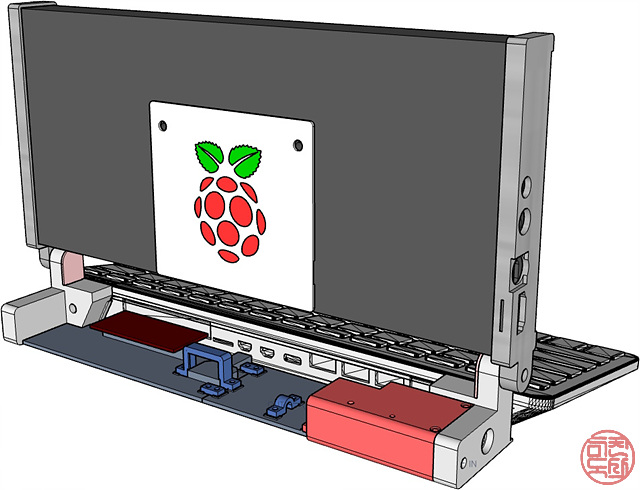 키보드와 모니터에 각각에 맞는 기구물을 만들어 붙이고, 그 기구물끼리 경첩 구조로 연결한다. 이를 통해 노트북처럼 디스플레이를 열고 닫을 수 있게 한다. - 🧩 GPIO 확장 보드 기본 장착