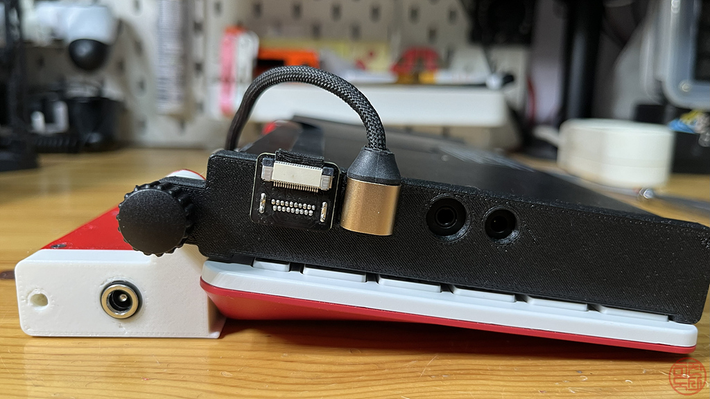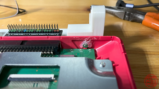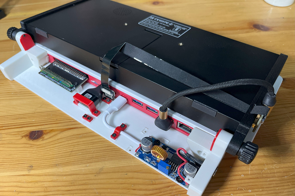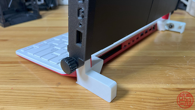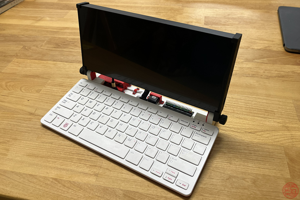 키보드와 모니터에 각각에 맞는 기구물을 만들어 붙이고, 그 기구물끼리 경첩 구조로 연결한다. 이를 통해 노트북처럼 디스플레이를 열고 닫을 수 있게 한다. - 🧩 GPIO 확장 보드 기본 장착
