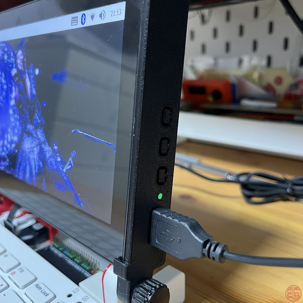 pi400과 모니터는 HDMI 연결 외에도 USB로 연결하여 기본적으로 터치 패널 기능을 사용할 수 있도록 한다. - 🧵 깔끔한 케이블 정리