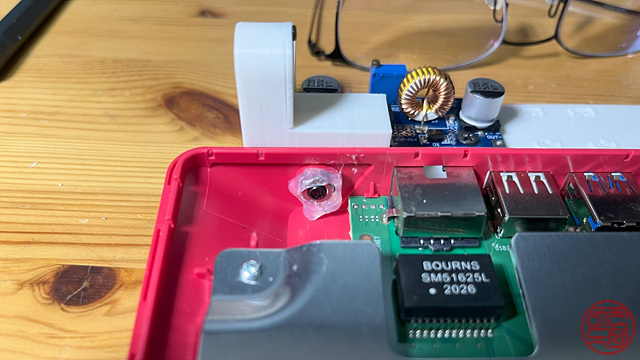 모듈의 출력단에는 USB-C 케이블을 직접 연결해 pi400에 전원을 공급하는 구조로 구성했다. 그리고, 이 전원 모듈은 위에 언급한 플레이트에 고정하고, 덮개를 만들어 회로를 보호하도록 했다. 덮개는 완전 밀폐형이 아니라 외부에서는 잘 안 보이는 쪽을 향해 오픈된 형태로 발열에도 통풍이 되게 했다.