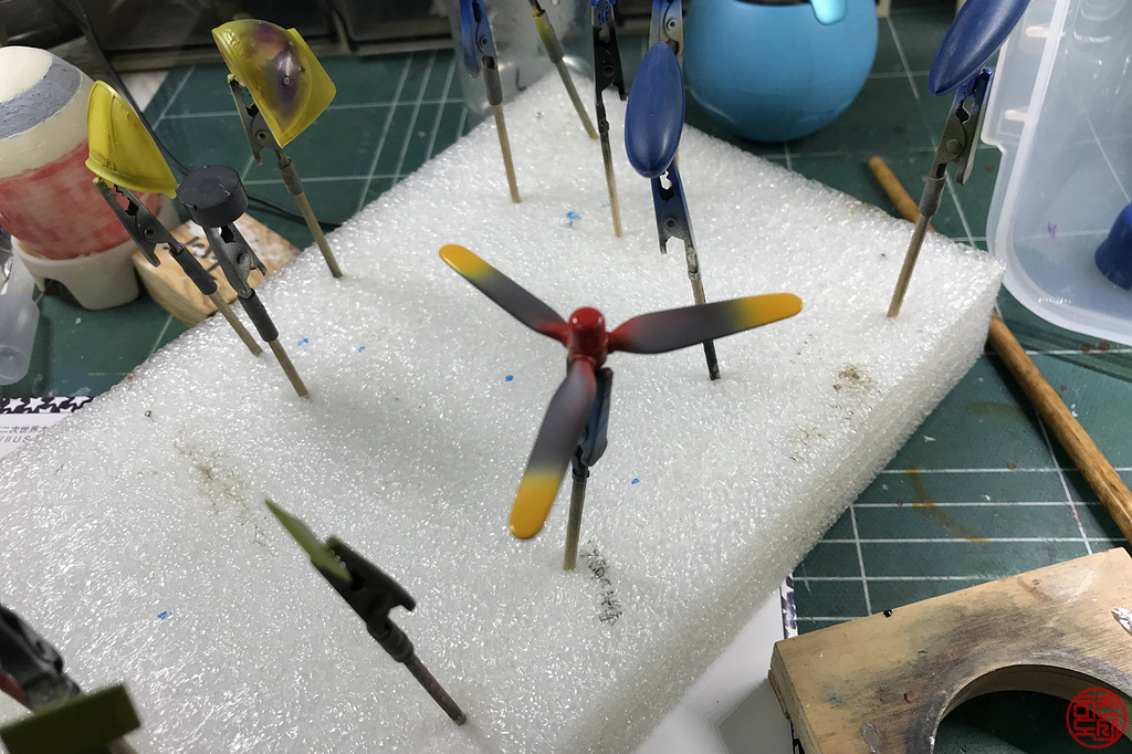 프로펠러의 원색 부분부터 칠하고요.