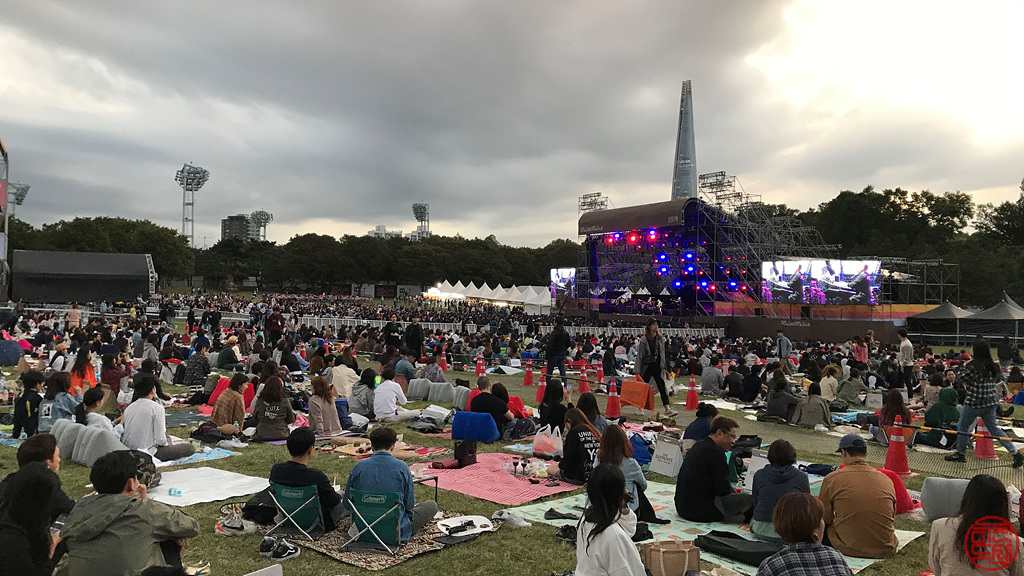 코다라인의 공연은 해가 질 무렵이었다. 날이 흐려서 해가 지는 아름다운 모습은 볼 수 없어 좀 안타까웠다. 저 멀리 롯데타워도 보인다.