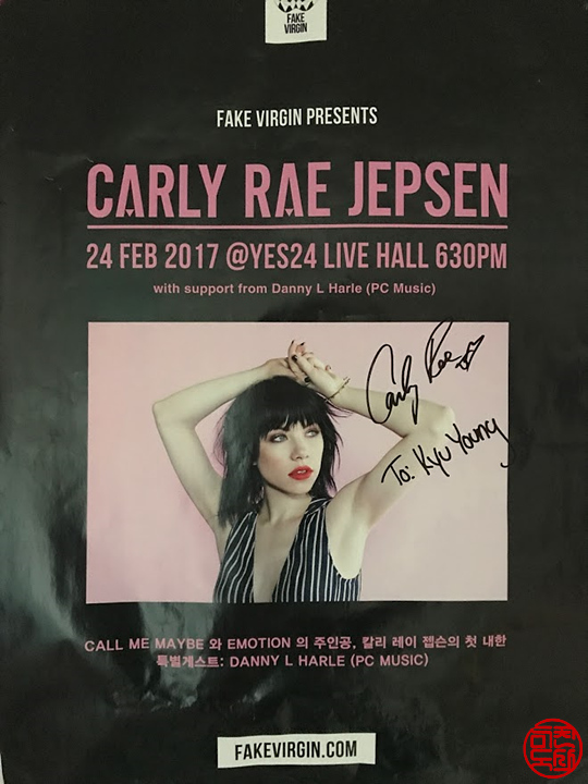 그리고, 7월 말에 더워 죽을 것 같은 날에 공장에서 일하고 있는데, 규영이한테서 전화가 왔다. 슬라슬라에 '칼리 레이 젭슨 (Carly Rae Jepsen)'이 합류한다 그런다. 부랴부랴 찾아보니, 내가 예매한 날에 칼리도 온다는 것이다. 칼리레이젭슨은 'Call Me Maybe'란 곡이 크게 히트했고 그 곡이 수록된 Emotion이란 앨범이 꽤나 흥행에 성공했던 캐나다 가수이다. 2년 전에 내한을 했는데, 그 공연을 규영이가 갔었다. 팬미팅 이벤트에도 당첨이 되었는데, 공연 즈음에 가수가 감기에 심하게 걸려서 팬미팅이 취소되고 대신 포스터에 사인을 해서 받은 적이 있다.