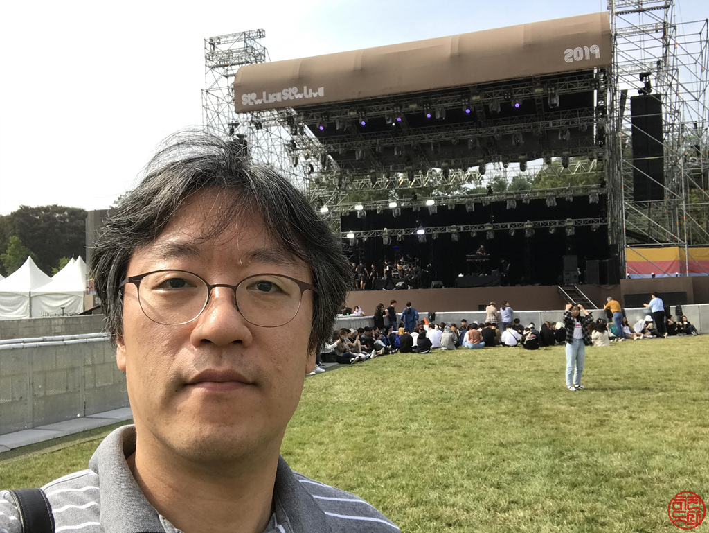 이 사진을 찍어서 고등학교 동기 톡방에 올렸더니, 바로 이번 공연 총감독을 맡은 친구 성욱이가 내 앞에 보인다. 내가 올린 사진 보고 찾아 왔댄다. ㅋㅋ. 며칠 동안 밤늦도록 무대 만들고, 공연 당일은 스팅 팀이 새벽에 도착해서 바로 사운드 체킹하고 준비하느라 많이 피곤하단다. 이런 이들의 노력으로 우린 공연을 편하게 보는 것이다.