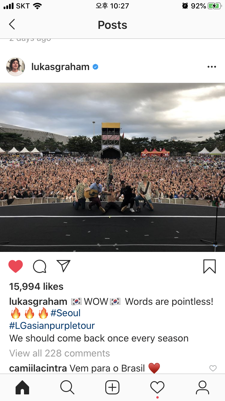 이 친구는 노래가 내 취향은 아니라 생각했는데, 음색이 독특하고 목청이 엄청 좋아서 라이브로 들으니 굉장히 인상적이었다. 관객들도 많았고 그 호응 또한 뜨거워서, 가수는 점점 더 흥분한 게 고스란히 느껴졌다. 부모님이 이 광경을 봐야 하는데, 어쩌고 저쩌고... 공연이 끝나고 인스타그램에 그 흥분을 그대로 남기기도 했다.