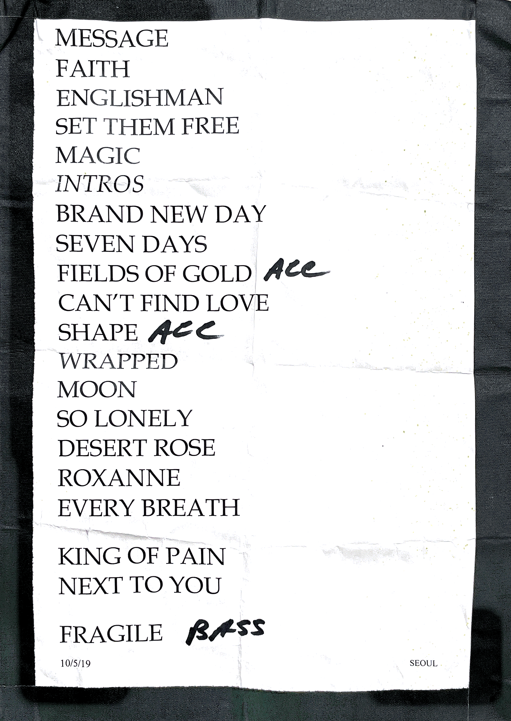 규영이도 자리에 앉아서 보려다가, 해가 지고 나서 추워서, 스탠딩 존 뒤에서 서서 봤단다. 비록 다 아는 곡은 아니지만, 아는 곡이 종종 나와서 검색도 해보면서 나름 재미있게 봤다 한다. 스탠딩 존 뒤쪽에서 규영이랑 얘기하고 있는데, 콘솔 쪽에서 스팅의 스탭이 셋리스트 출력한 걸 두 장 들고 나와서 근처 관객들에게 나눠줬다. 규영이가 그걸 하나 사진을 찍었는데, 거기엔 마지막에 Fragile이 쓰여있었다. 아마도 시간이 되면 Fragile까지 하려 했나 보다. 정해진 시간이 있어서, Fragile까진 못 했나 보다. 조금 안타깝긴 한데, 90분을 쉼없이 정말 열심히 해준 스팅이었기에 아쉬움은 없었다.