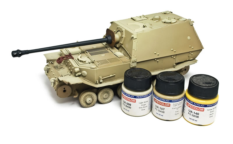 Light Stone, Italian Sand, Yellow로부터 여러 혼합색을 만들고, 여러 작은 부품들의 표면을 위쪽 앞면은 가장 밝으면서 모형의 뒤(사진에서의 앞뒤가 아닌, 전차의 물리적인 뒤쪽 방향)로 가면서 점차적으로 어둡게 하면서 붓질한다.