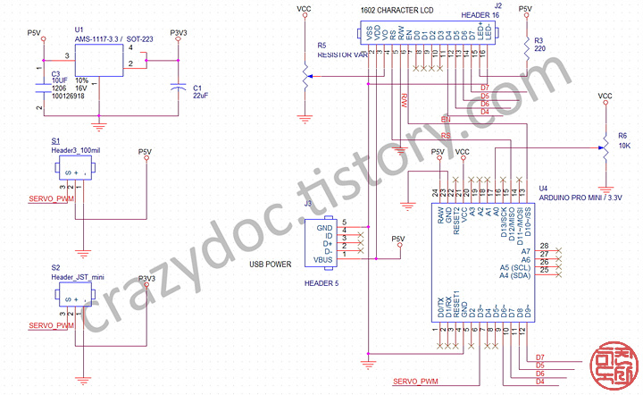 5V는 microUSB 커넥터를 통해 공급받고, 서버용 3.3V는 AMS-1117-3.3이란 작은 레귤레이터를 하나 썼습니다.