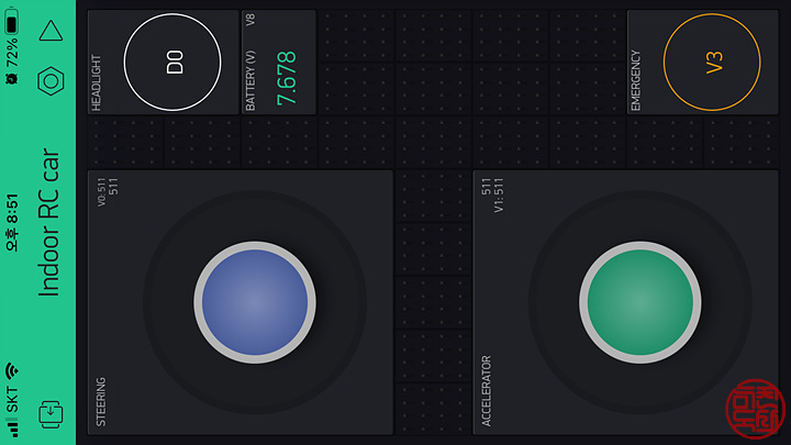 블링크 앱은 직접 아날로그 입력 혹은 디지털 I/O와 연동시킬 수 있기도 하지만, 가상 포트를 지정해서 아두이노 프로그램에서 기능을 좀 더 추가하여 넣을 수 있다. 구현된 기능 중에 헤드라이트를 제외한 모든 기능을 가상 포트로 지정했다.