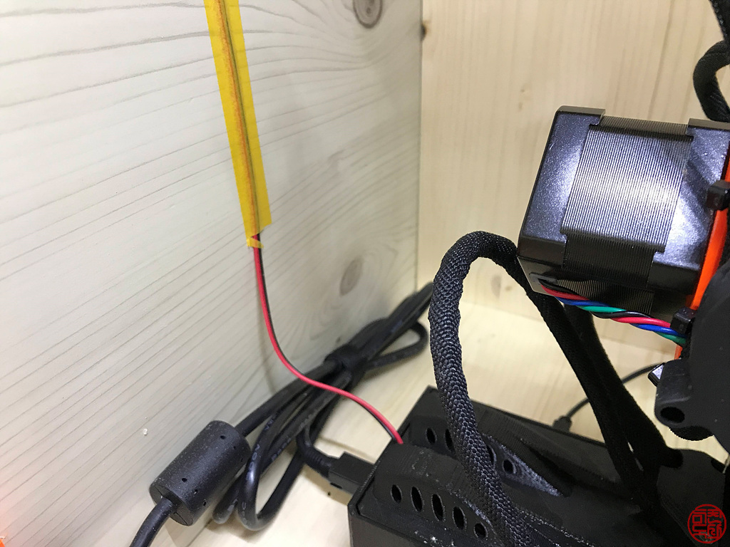 프루사에서 나오는 전원 케이블은 뚜껑 끝을 조금 잘라내서 뽑아내고 뒷면 벽을 타고 천정을 통해 지나가도록 하게 했습니다.