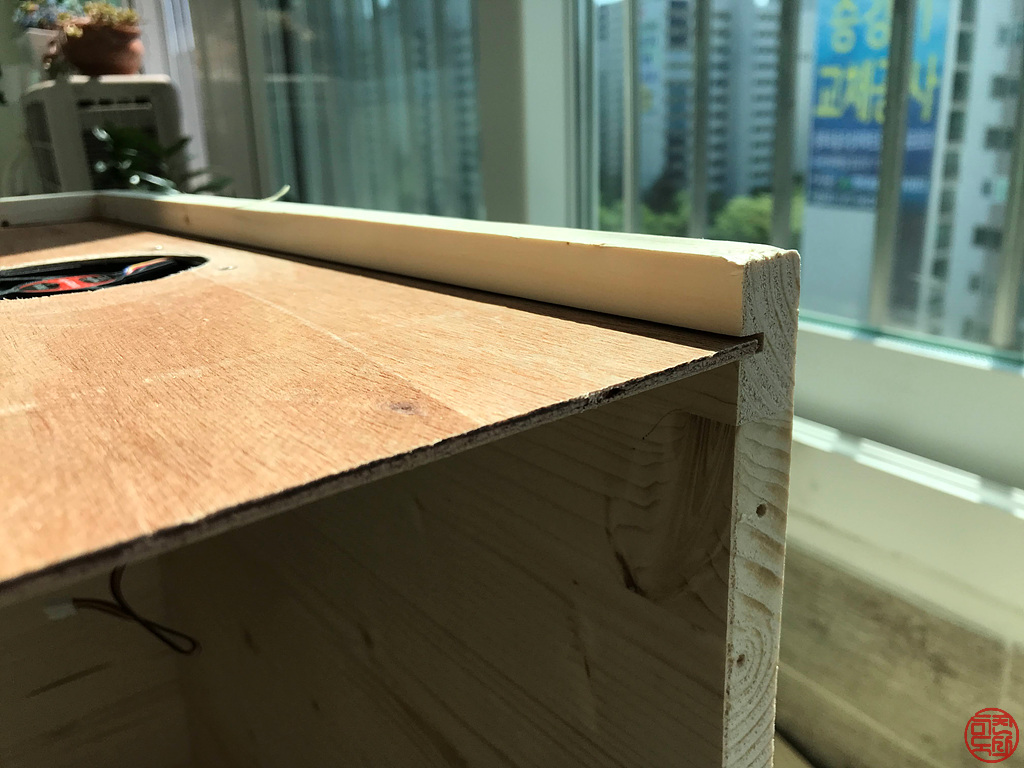 아래, 위, 옆 면에도 뒤쪽으로 좁은 홈가공 주문을 해서, 뒷판을 슬라이딩해서 밀어넣을 수 있게 했습니다.