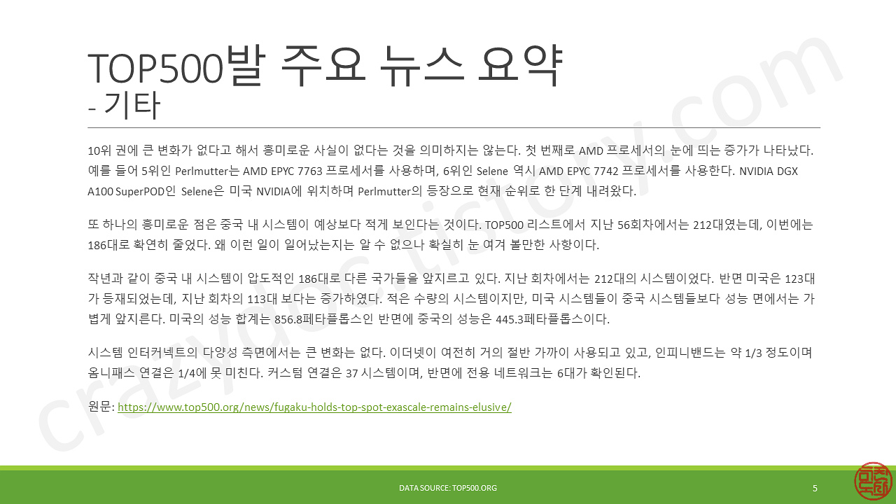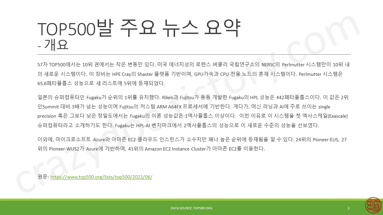 이렇게 해서 2021년 6월 28일에 발표된 57회차 TOP500 수퍼컴 순위를 훑어보았습니다. 충격적인 결과는 없지만, 소소한 재미가 많은 순위였습니다. 나름 업계 흐름도 짐작해볼 수 있었고요.