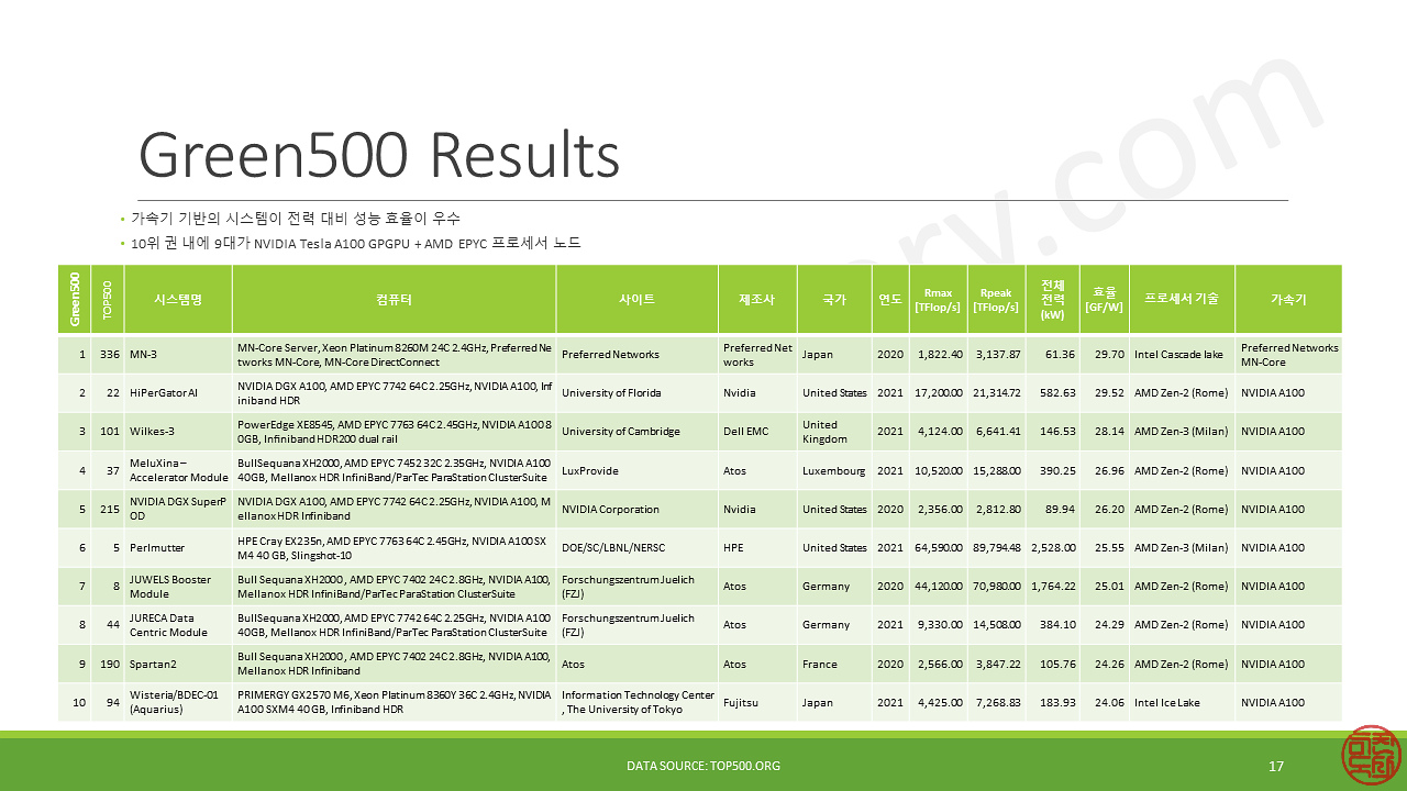1위는 일본의 전용 가속기를 사용한 시스템이고, 나머지 9대는 모두 NVIDIA의 A100을 채택한 시스템이네요.
