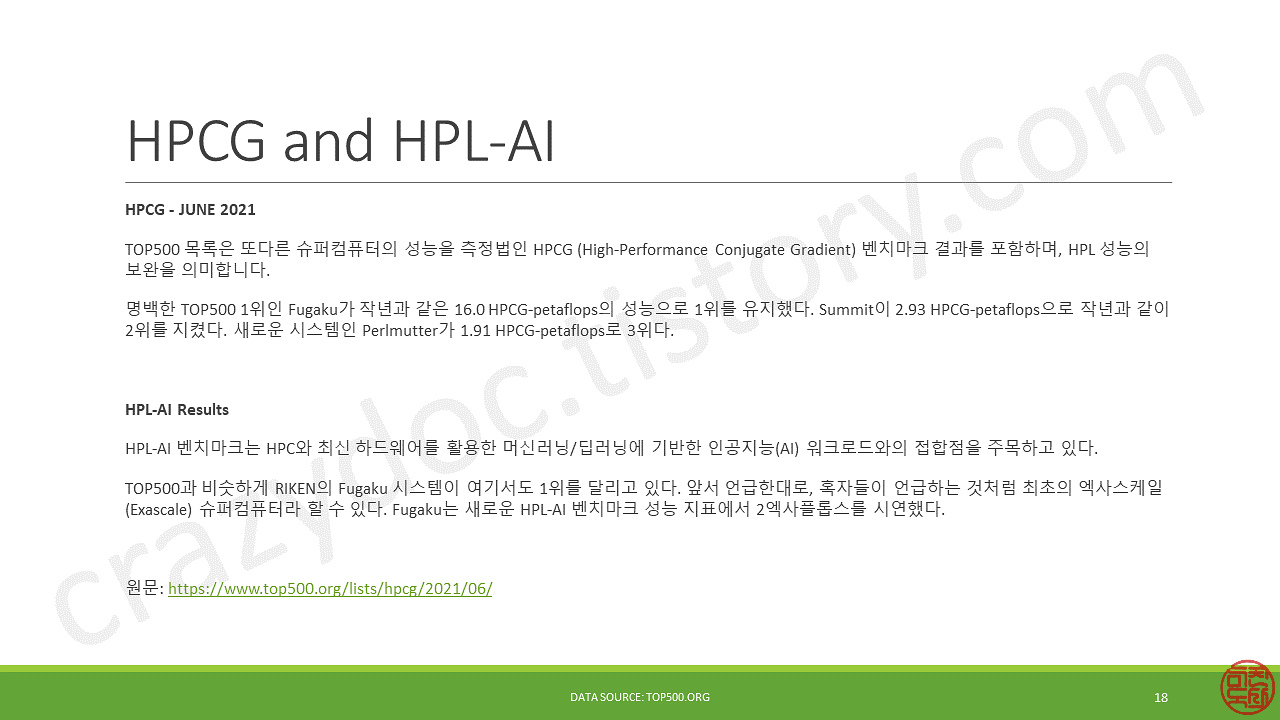 그리고, HPC라는 개념에 머신러닝/딥러닝 (이하 ML/DL) 개념이 투영되기 시작하면서 그 범위가 넓어지는 것 같은데요, 이게 기존 HPC 연산과 ML/DL 연산이 성격이 완전히 다릅니다. ML/DL은 half precision 연산에 포커스가 맞춰집니다. ML/DL 전용 시스템을 DP 연산까지 할 수 있는 구성을 할 필요는 없는 거지요. 그래서, ML/DL을 위한 새로운 연산 성능 벤치마크가 등장한 것이 HPL-AI입니다.