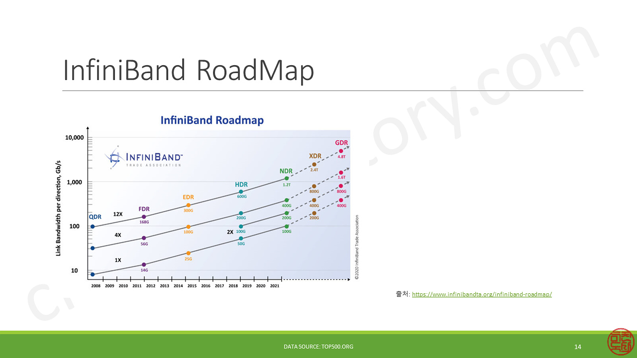 인피니밴드 자료를 찾다 보니, 이미 멜라녹스 쪽에서 차세대 인피니밴드 규격인 NDR 제품 소개가 있길래 로드맵을 찾아보았습니다. NDR은 400G에요. 현재 PCI Express Gen4의 최고 대역폭이 HDR(200G)을 커버할 수 있는 건데, NDR은 Gen5를 지원할 건지 궁금하네요.