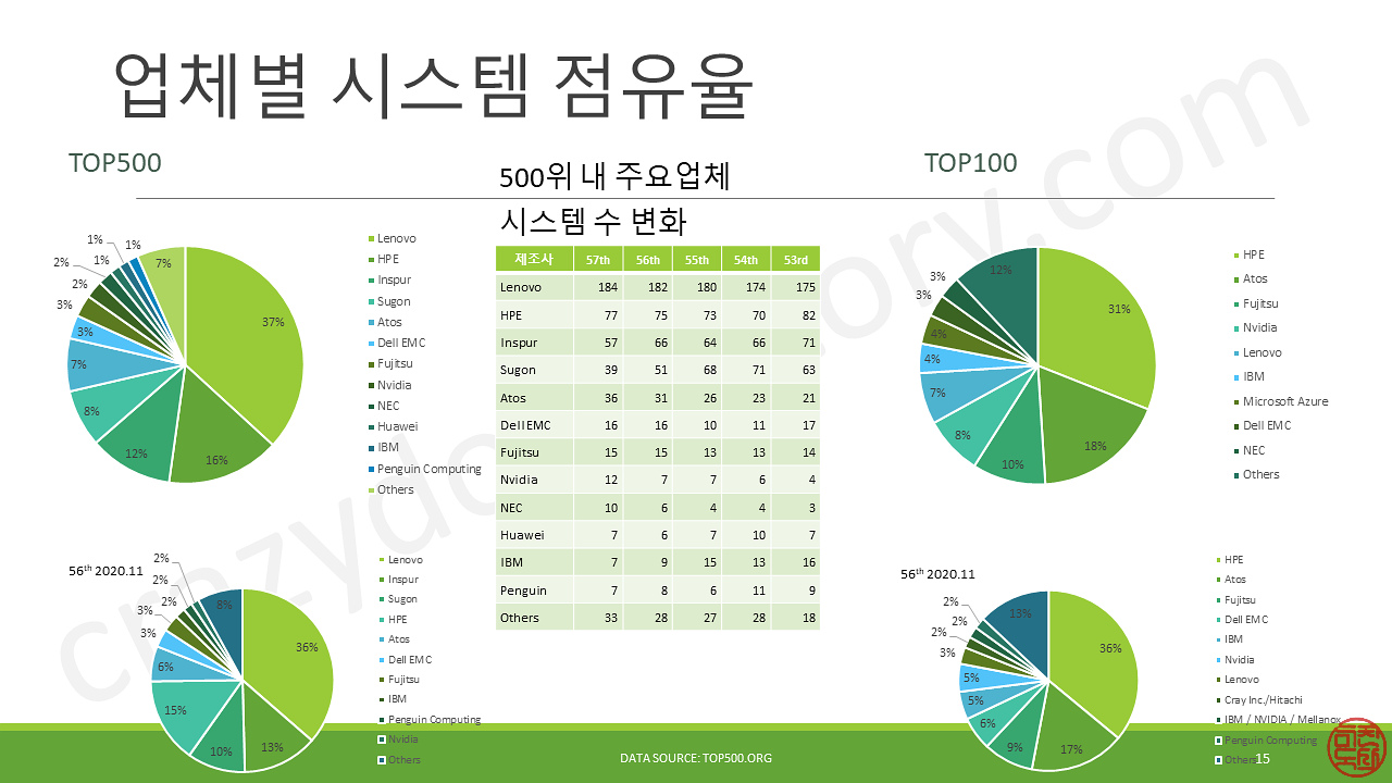 물론 100위까지의 대형 HPC의 경우에는 여전히 Cray를 합병한 HPE가 절대 강자이긴 합니다.