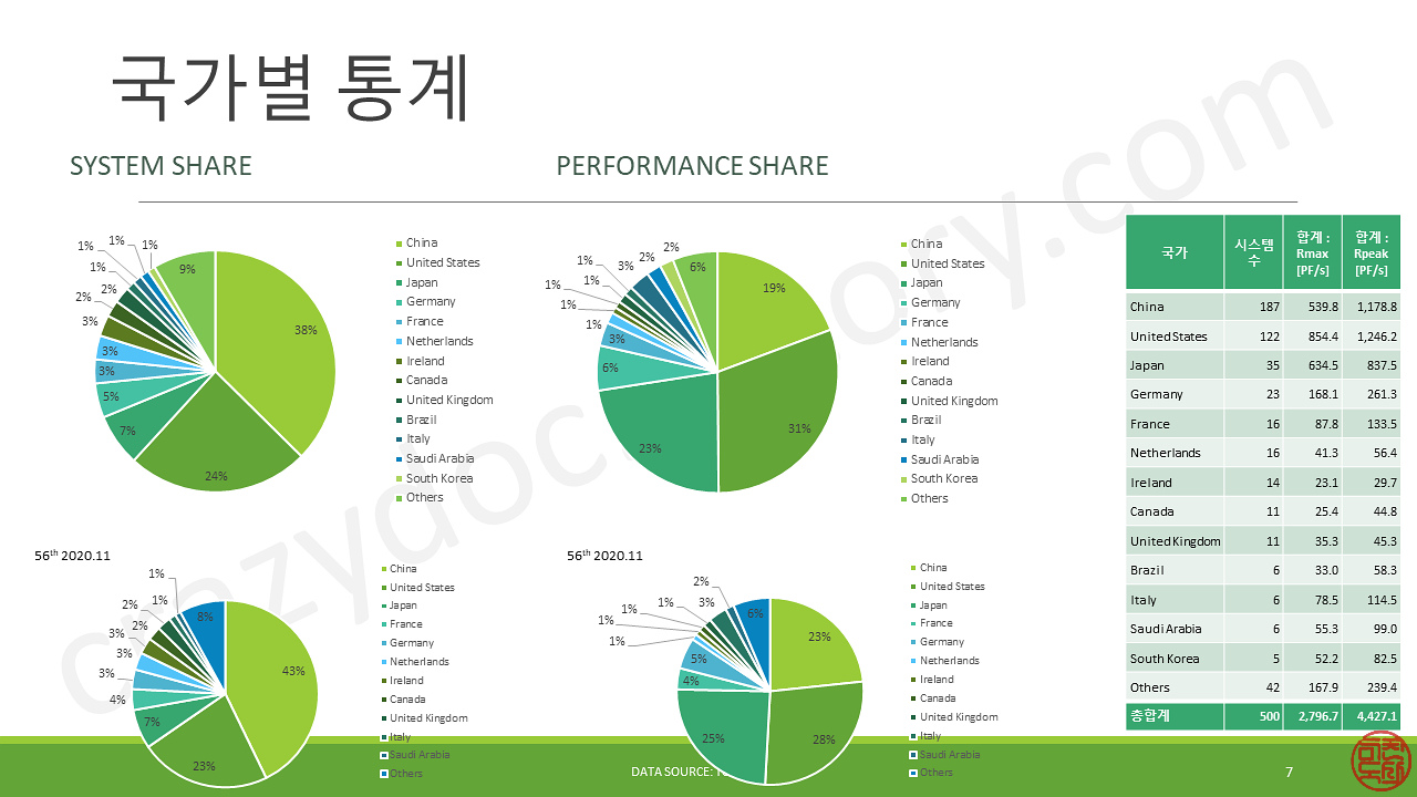 또 상대적으로 7%의 시스템 점유율인 일본이 성능 쪽에서는 중국보다도 높은 점유율을 보입니다.