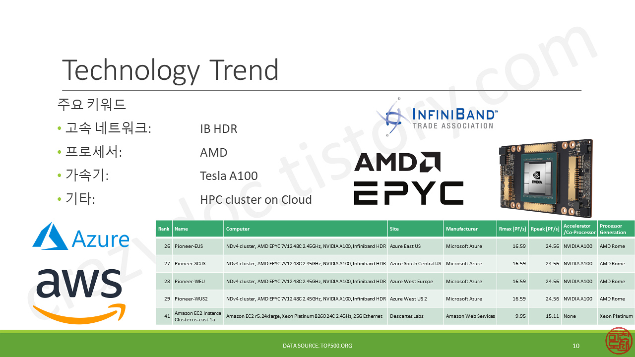 TOP500 공식 뉴스에도 언급이 되었는데, 이번에 처음으로 클라우드 안에 구축된 HPC 클러스터들이 순위에 진입했습니다. 그것도 규모가 상당해서 20위권과 41위입니다.