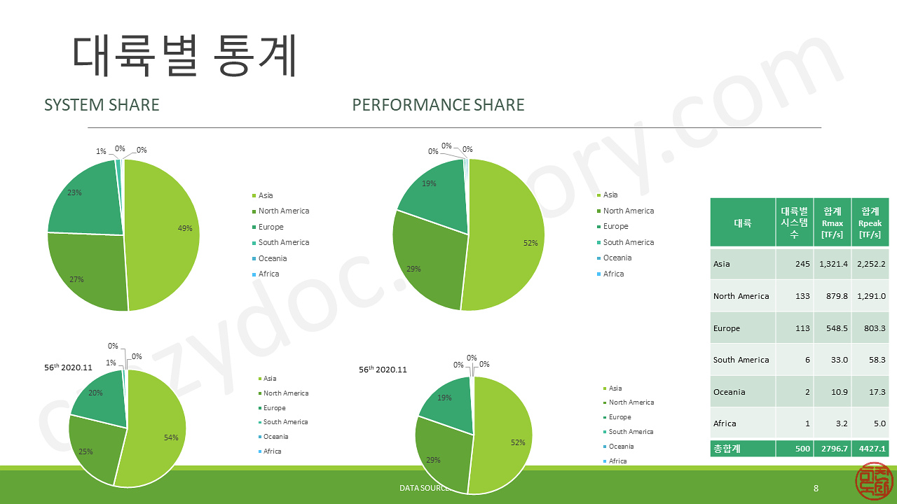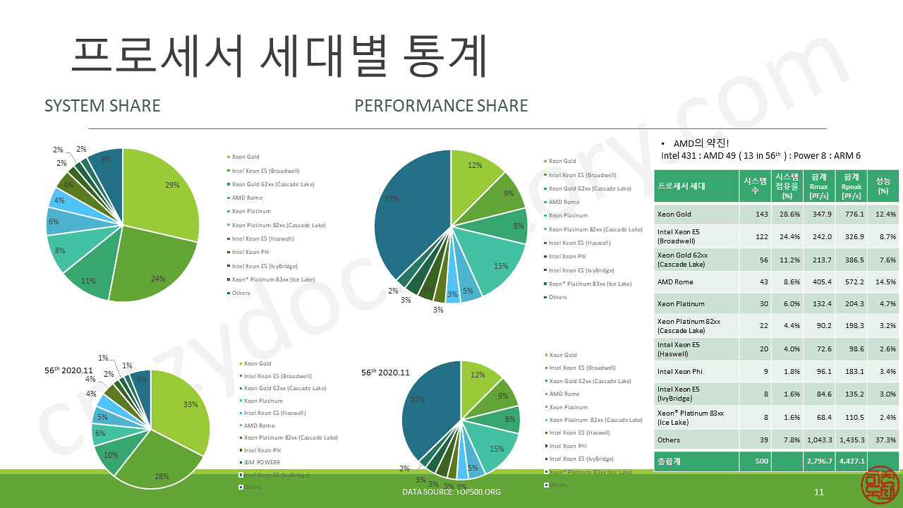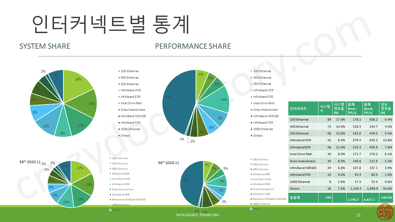 이제부터는 각종 통계 자료를 만들어 보았습니다. 기본적으로 TOP500 리스트를 기반으로 재구성한 것입니다.