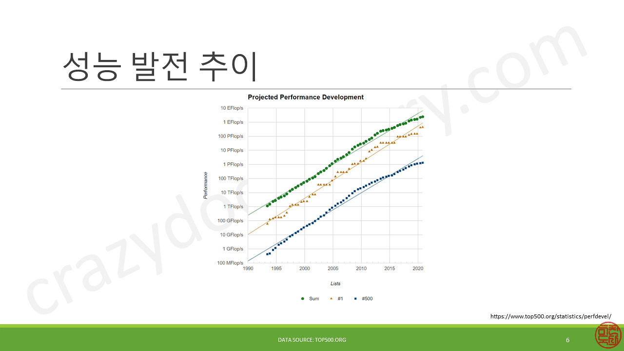 TOP500이 처음 발표된 이후의 성능 추이입니다.