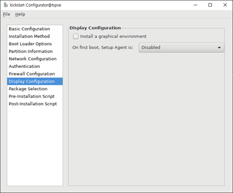 - Display Configuration: 설치하고 나서 라이선스 동의 등의 초기 설정 화면 나오는 것을 끌 수 있다.